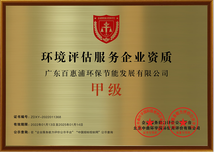 广东百惠浦环保节能发展有限公司持有环境评估服务企业资质(甲级)(证书编号:ZDXY-2022011368),由北京中鼎环宇国际信用评价有限公司评定。该资质是对公司在环境影响评价、环保技术评估、项目环境合规咨询等领域专业能力的权威认证,标志着百惠浦具备为工业企业提供专业、高效、合规的环境评估服务的甲级服务能力。
