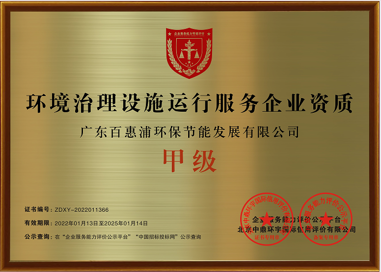 广东百惠浦环保节能发展有限公司持有环境治理设施运行服务企业资质(甲级)(证书编号:ZDXY-2022011366),由北京中鼎环宇国际信用评价有限公司评定。该资质是对公司在污水处理、环保设备运维、系统稳定运行管理等领域专业服务能力的权威认证,标志着百惠浦具备为各类工业环境治理设施提供专业、高效、合规运行服务的甲级能力。