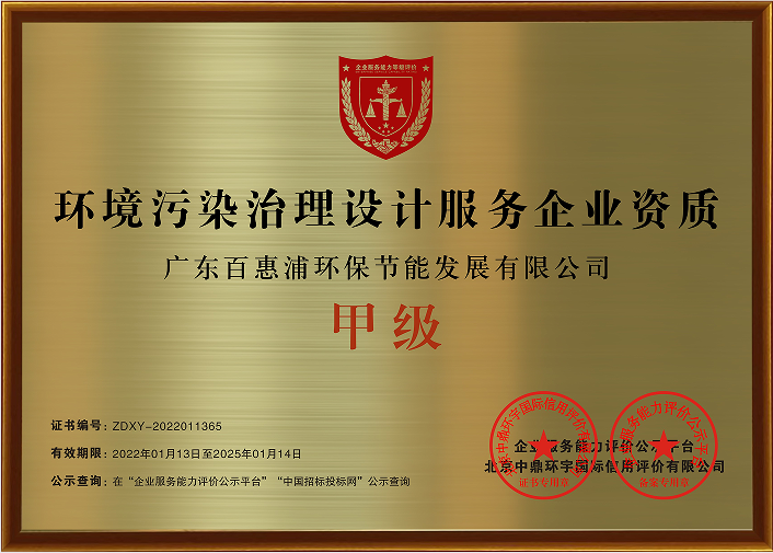 广东百惠浦环保节能发展有限公司持有环境污染治理设计服务企业资质(甲级)(证书编号:ZDXY-2022011365),由北京中鼎环宇国际信用评价有限公司评定。该资质是对公司在工业废水、废气、固废等环境污染治理领域方案设计、工艺研发、工程规划能力的权威认证,标志着百惠浦具备为各类工业企业提供专业、合规、高效的环境污染治理设计服务的甲级能力。