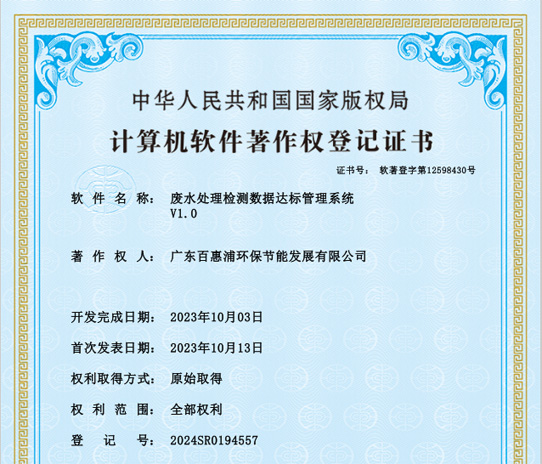 广东百惠浦环保节能发展有限公司拥有 **《废水综合处理远程监控系统 V1.0》计算机软件著作权 **,获中华人民共和国国家版权局登记认证。该著作权是公司在废水处理设施远程化、集中化管控领域的核心技术成果,彰显了百惠浦在环保设备数字化、跨场景智能管理方面的自主研发能力与技术创新实力。