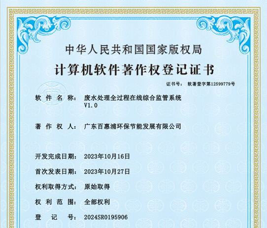 广东百惠浦环保节能发展有限公司拥有 **《废水处理全过程在线综合监管系统 V1.0》计算机软件著作权 **,获中华人民共和国国家版权局登记认证。该著作权是公司在废水处理全流程智能化管控领域的核心技术成果,彰显了百惠浦在环保设施数字化、全链条管理方面的自主研发能力与技术创新实力。